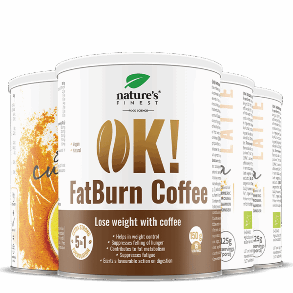• OK!FatBurn Coffee: Z aktivnimi sestavinami L-karnitina, bezga in izvlečka guarane – Pripomore k metabolizmu maščob, zmanjšuje željo po jedi in zavira občutek lakote