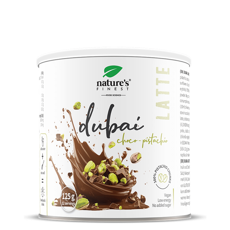Dubai latte z le 28 kcal na odmerek združuje pistacijo, kakav, inulin in klorelo za bogat okus, ki podpira vaše počutje.