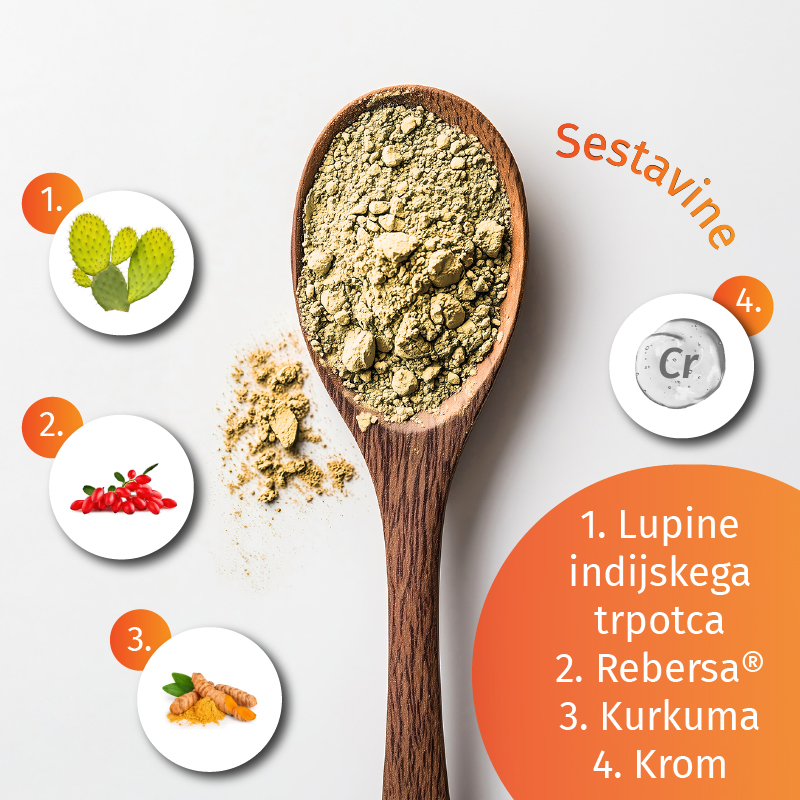 Sestavine: inulin v prahu, izvleček stebla opuncije (nopal) 10:1 (Opuntia ficus-indica), aroma manga, aroma limone, izvleček baldrijana (Valeriana officinalis, korenina), stabilizator: celuloza, Rebersa® hidroklorid (izvleček Berberis aristata), od tega 97 % berberinovega klorida, izvleček kurkume (Curcuma longa, korenina), cimetov prah (Cinnamomum zeylanicum, lubje), sladilo: steviol glikozidi iz stevije, kromov pikolinat. Vsebuje naravno prisotne sladkorje.