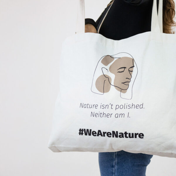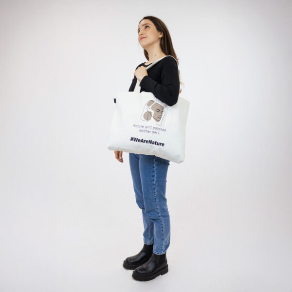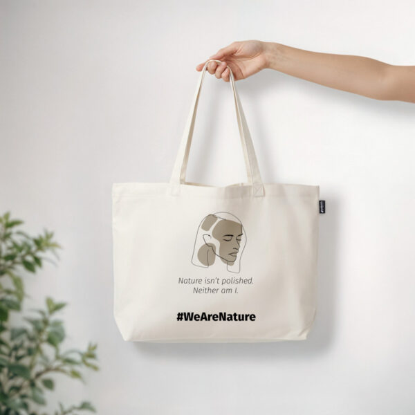 Brezčasna tote torba, zasnovana za sproščen slog in vsakodnevno uporabo. Potiskana z navdihujočim sporočilom »Narava ni zloščena. Tudi jaz nisem.« skupaj z minimalistično linijsko ilustracijo umirjenega obraza, slavi pristnost in sprejemanje naravne lepote.