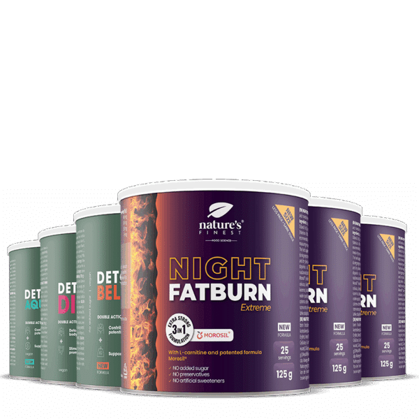 • Night Fatburn Extreme: Formula, ki podpira hujšanje in pomaga stabilizirati telesno težo⁶. Vsebuje patentirano formulo Morosil®, izvleček rdečega vina, L-karnitin ter izvleček baldrijana, ki pomaga ohranjati naraven spanec in prispeva k optimalni sprostitvi.