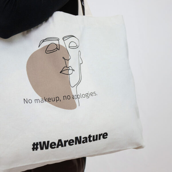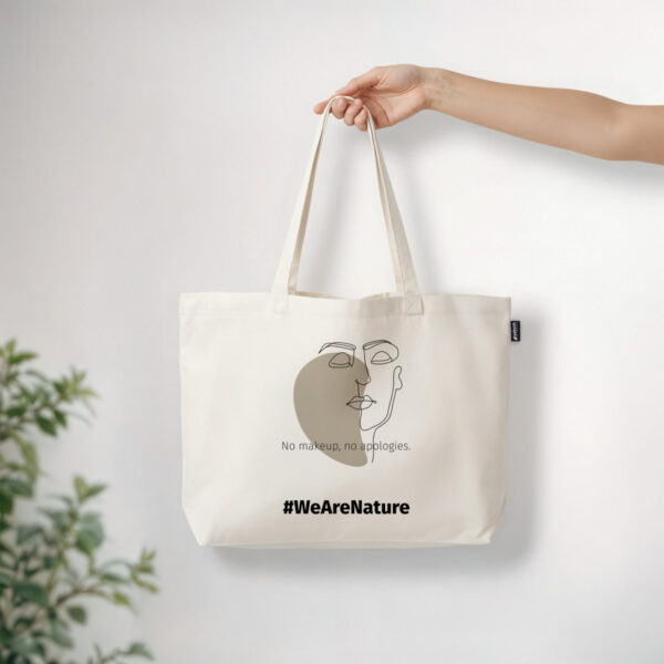 Brezčasna tote torba, ki slavi pristnost in samoizražanje. Z minimalistično linijsko ilustracijo umirjenega obraza pogumno nosi sporočilo “Brez ličil, brez opravičil,” ter nas spodbuja, da sprejmemo svojo naravno podobo.