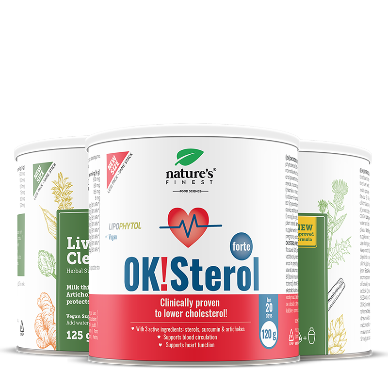 • OK!Sterol Forte: Patentirana formulacija Lipophytol® z rastlinskimi steroli – Dokazano naravno znižuje raven  holesterola, podpira zdravje srca
