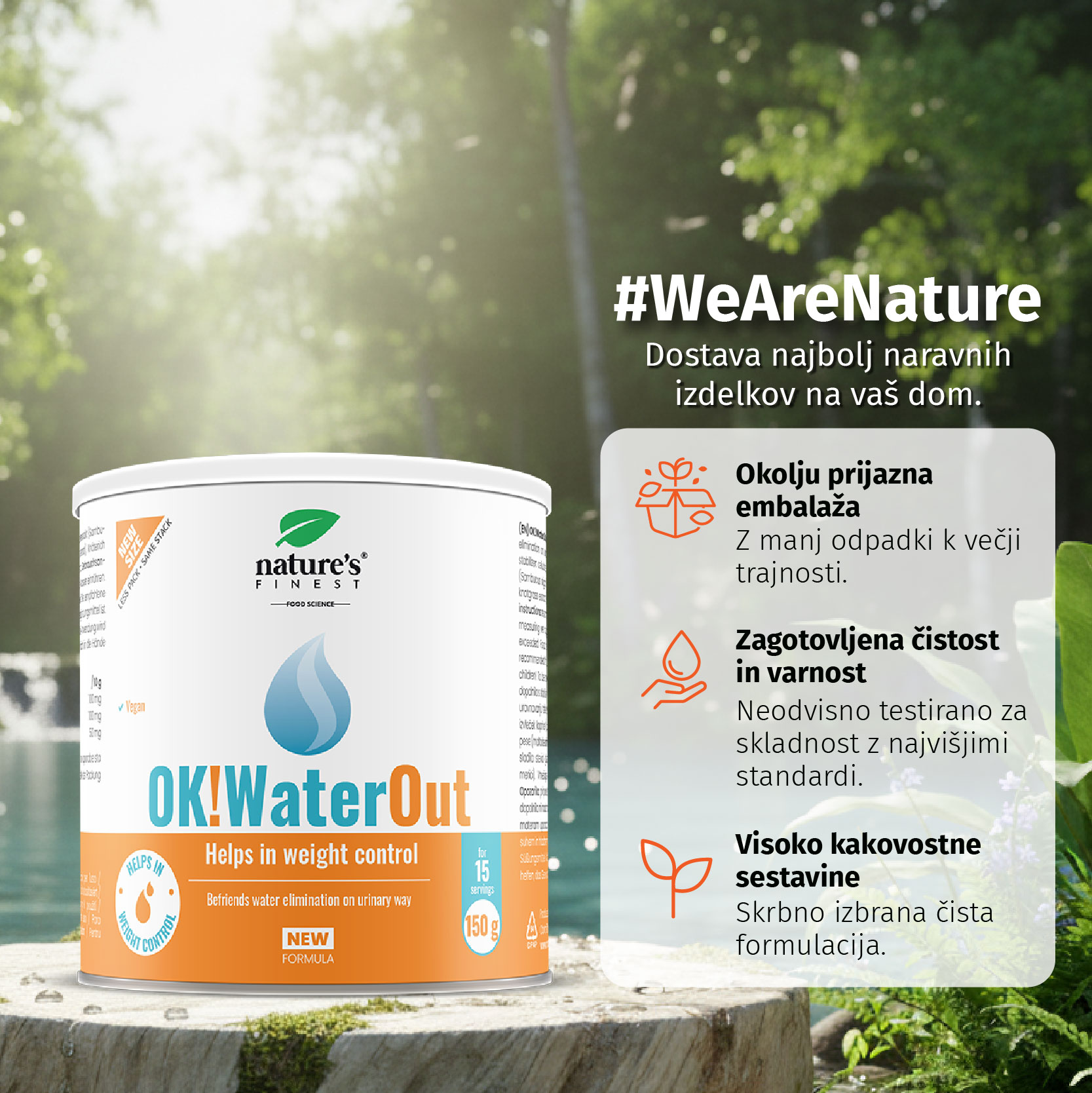OK!WaterOut s svojimi naravnimi sestavinami spodbuja izločanje vode z sečili³, hkrati pa podpira vitalnost telesa¹ in pomaga ohranjati vašo telesno težo²