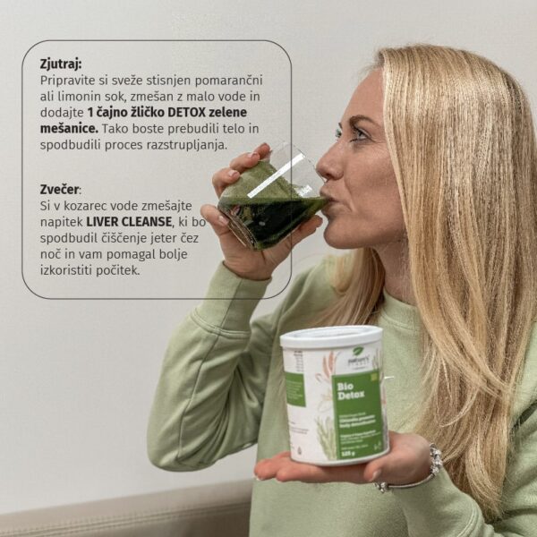 Zjutraj si pripravite sveže stisnjen pomarančni ali limonin sok, zmešan z malo vode in dodajte 1 čajno žličko DETOX zelene mešanice. Tako boste prebudili telo in spodbudili proces razstrupljanja.