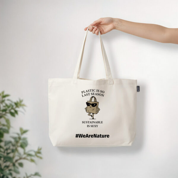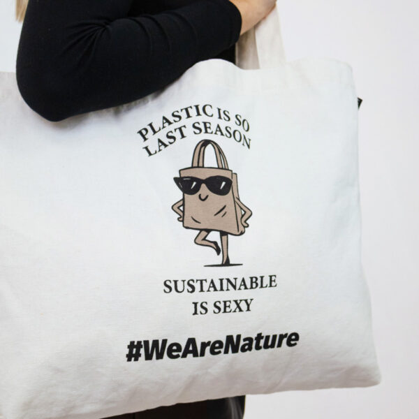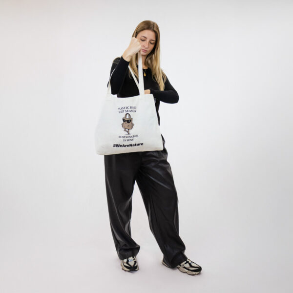 Brezčasna torba, zasnovana za vsakdanji slog s trajnostno noto. Potiskana z igrivim sporočilom “Plastika je tako prejšnja sezona. Trajnostnost je privlačna.” in prikupno ilustracijo samozavestne nakupovalne vrečke s sončnimi očali prinaša humor in odnos v zavestno življenje.