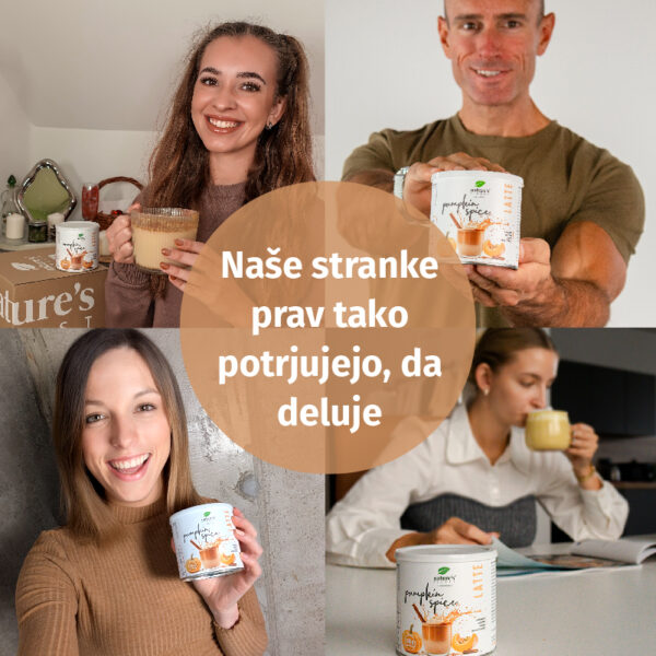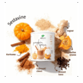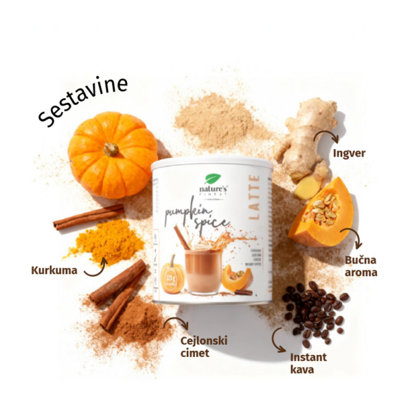 Sestavine: Rižev napitek v prahu (riž, beta glukani iz ovsa, sončnično olje, sol), agava v prahu, sladilo: eritritol, kokosov napitek v prahu (kokosova smetana, rižev maltodekstrin), aroma buče, instant kava (Coffea arabica L.), aroma vanilije, cimet (Cinnamomum zeylanicum, lubje) v prahu, ingver (Zingiber officinale, korenina) v prahu, izvleček kurkume (Curcuma longa L., korenina).