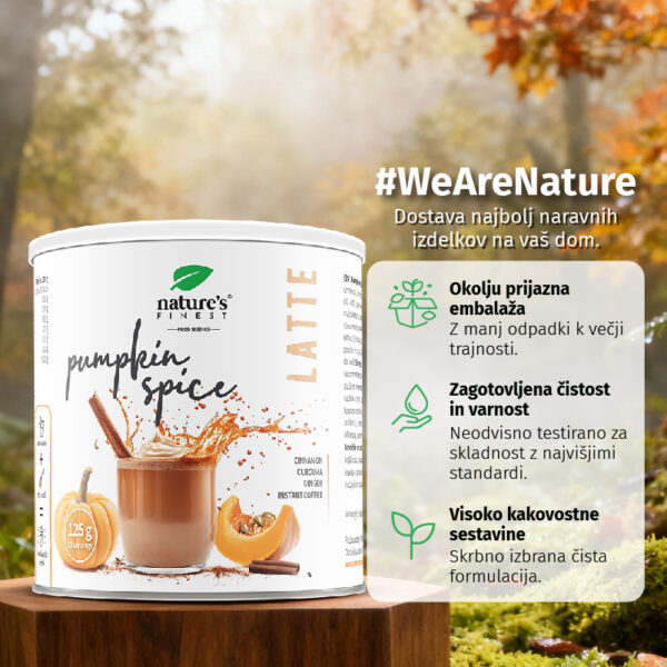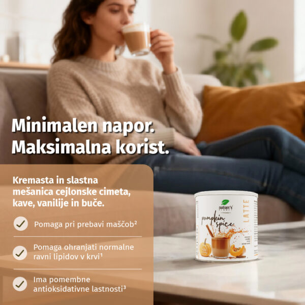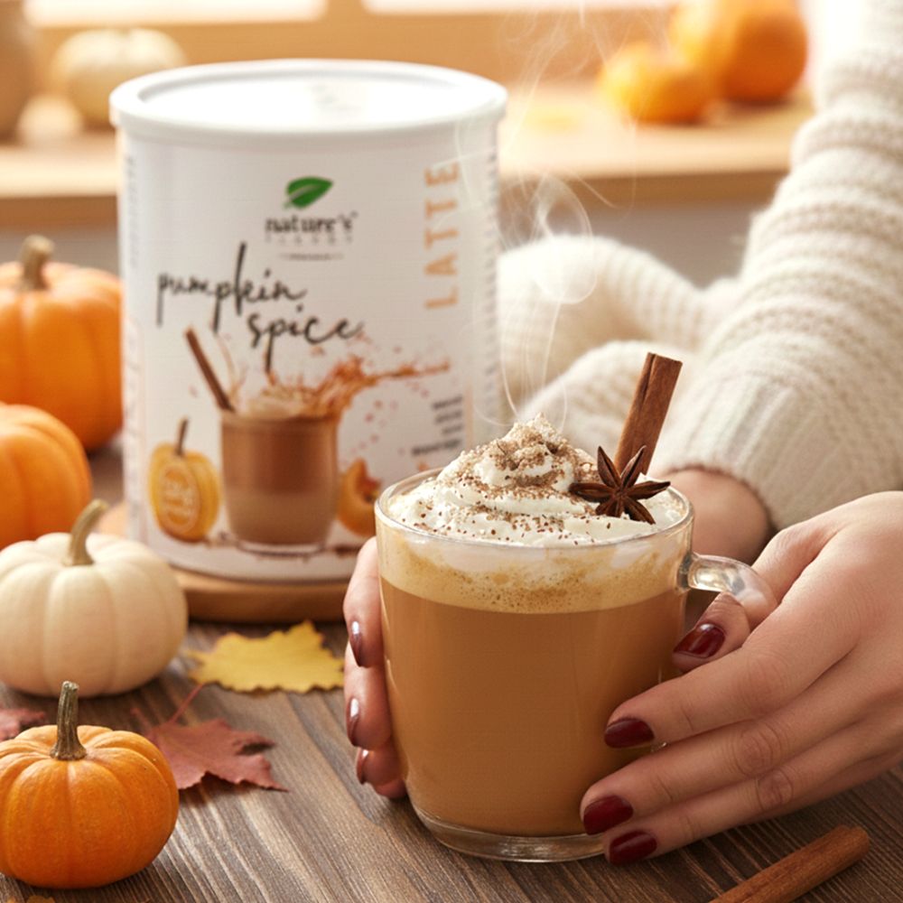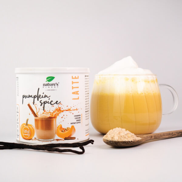 Združuje jesenske začimbe s kavo za okusen latte, ki blagodejno vpliva na vaše telo. Cimet prispeva k normalni ravni glukoze, kurkuma pomaga pri presnovi maščob, ingver pa podpira prebavo, energijo, vitalnost in telesno počutje.