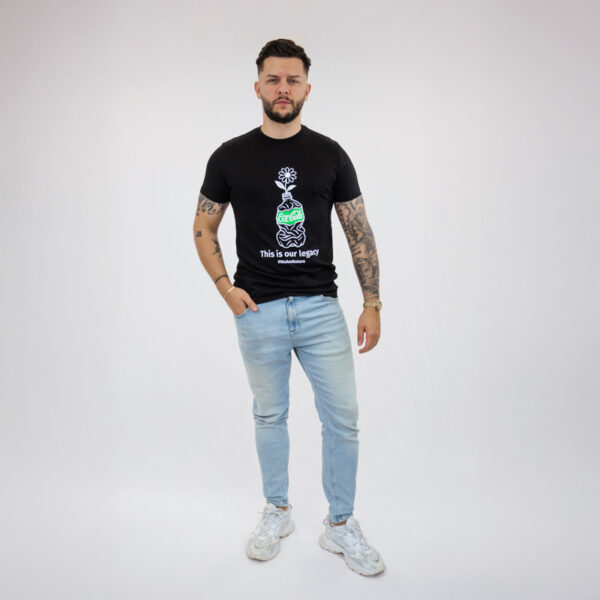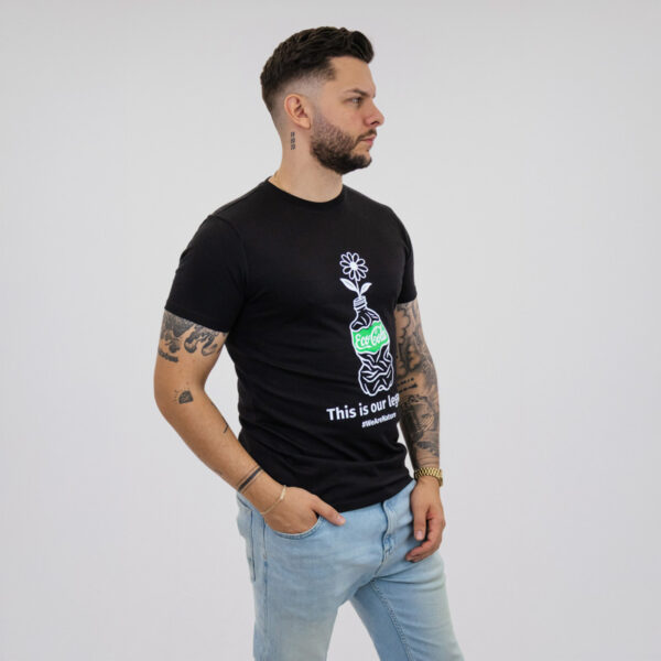 Elegantna črna majica, ki združuje estetiko in pomen. Z izrazito belo ilustracijo rože, ki raste iz zmečkane steklenice, in živahnim zelenim poudarkom prinaša močno okoljsko sporočilo s pridihom subtilne umetniškosti. Mehka, udobna in preprosta za nošenje, je ta majica popolna za vse, ki cenijo premišljen dizajn in želijo pustiti tih, a močan vtis.